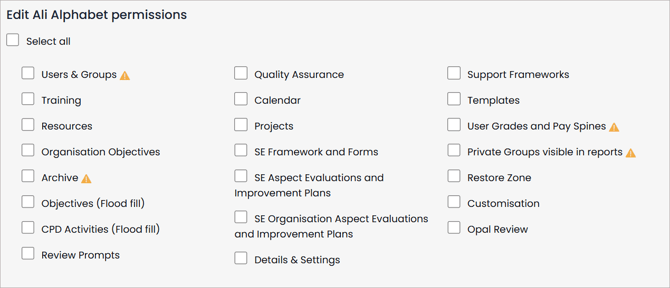 - We have flagged (⚠️) the permissions where personal, pay or appraisal-related data will be visible. You'll need to check with your Primary User if you're not sure whether you can or should assign these permissions.