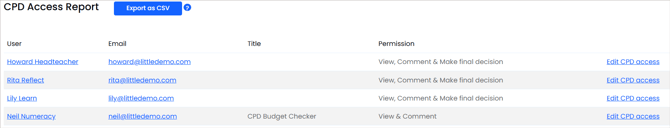 - You can edit each users permissions using the Edit CPD access link to the right of the report.