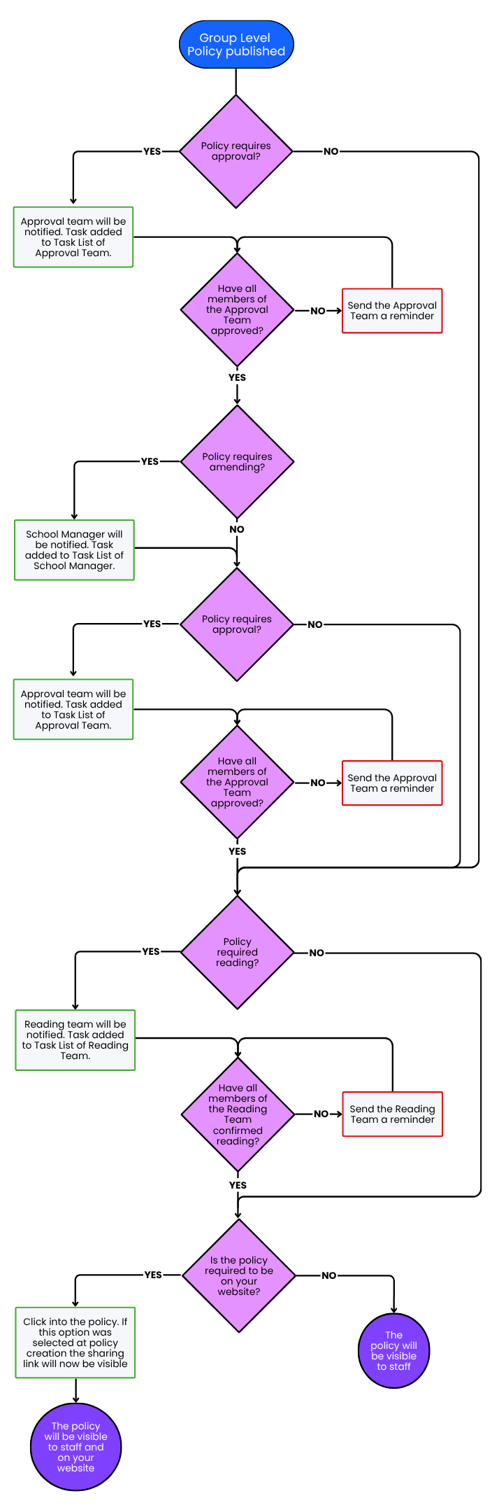 Understanding the Group Level Policy Workflow: Publish, Approve, Amend, Read This guide will show you the order of events after publishing a Group Level policy, depending on the requirements of the policy.