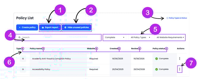 - Actions column - Click on the 3 dots to expand the Action options for each of your policies