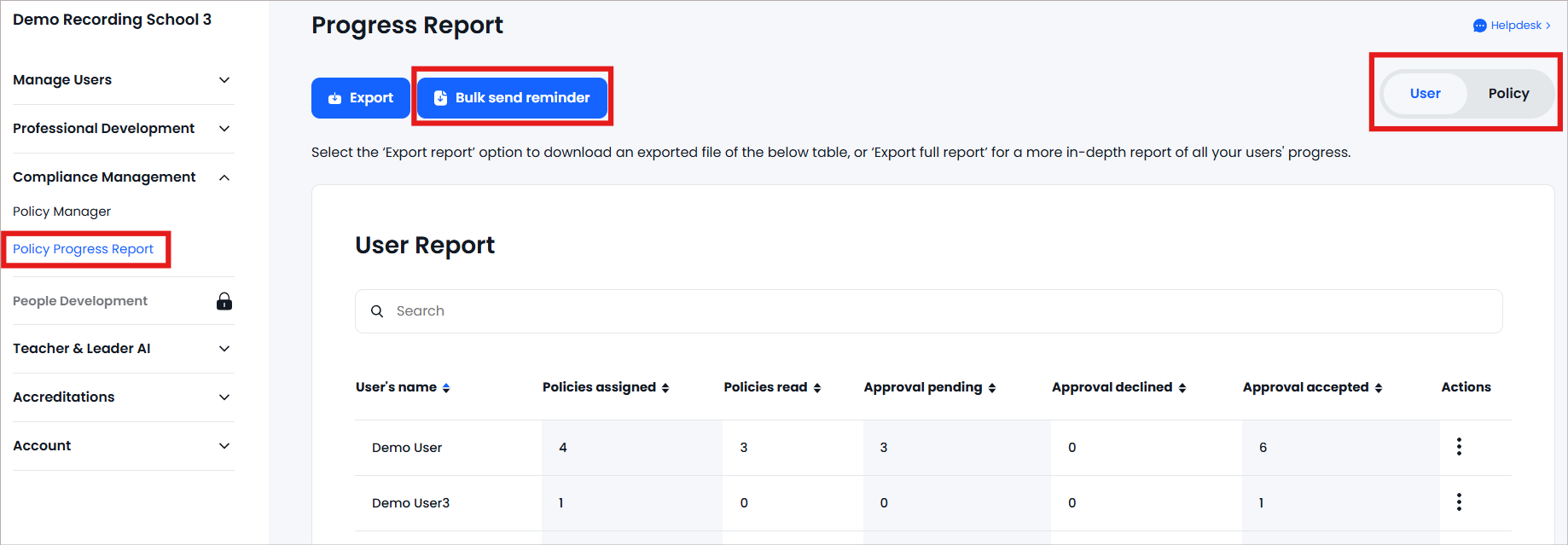 - Use the Bulk send reminder button to send a reminder email to those with outstanding policies to read