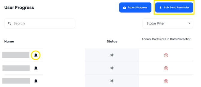 - To send an individual reminder click the ‘Bell’ icon which is shown to the right of each of your users names, once this has been clicked, an email reminder will be sent to that individual to complete the assigned content.