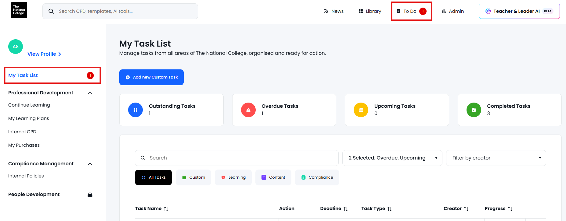 Locating My Task List To find your 'Task List' you can: Click on 'My Task List' from the left hand navigation or Click on 'To Do' from the top navigation which is visible from all pages across the app.
