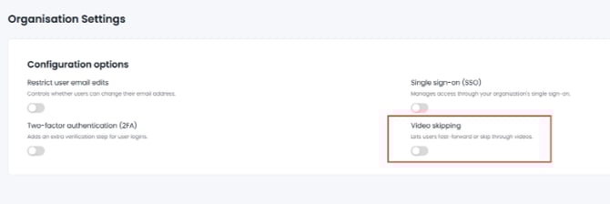 In the 'Organisation Settings' area you will see an option titled 'Video Skipping'