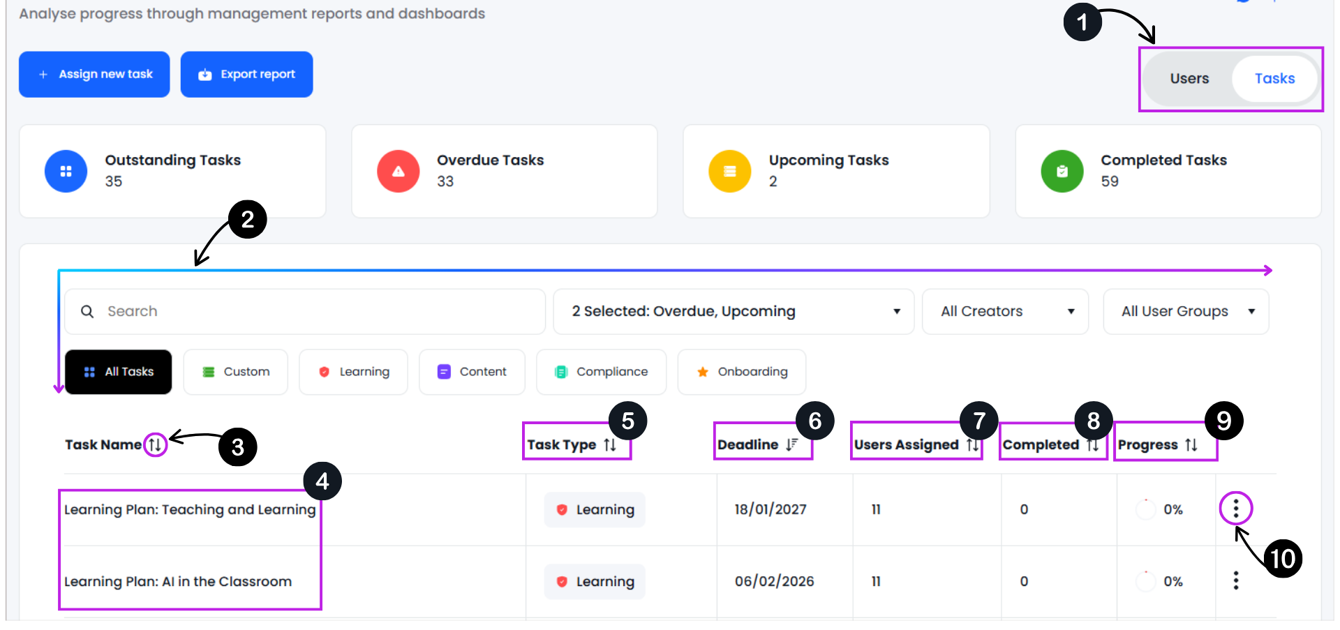 • It displays a list of all tasks assigned to all users across the Trust, alongside the completion status.