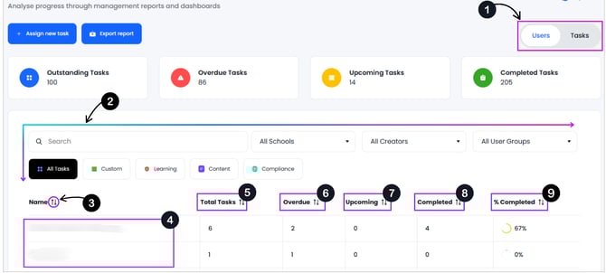 • It displays a list of all users within the trust alongside the status of the total number of tasks assigned to them.