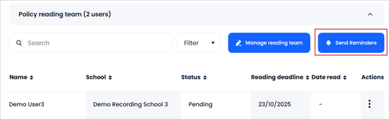 - Scroll to the Policy Reading / Approval Team section and select 'Send reminders'